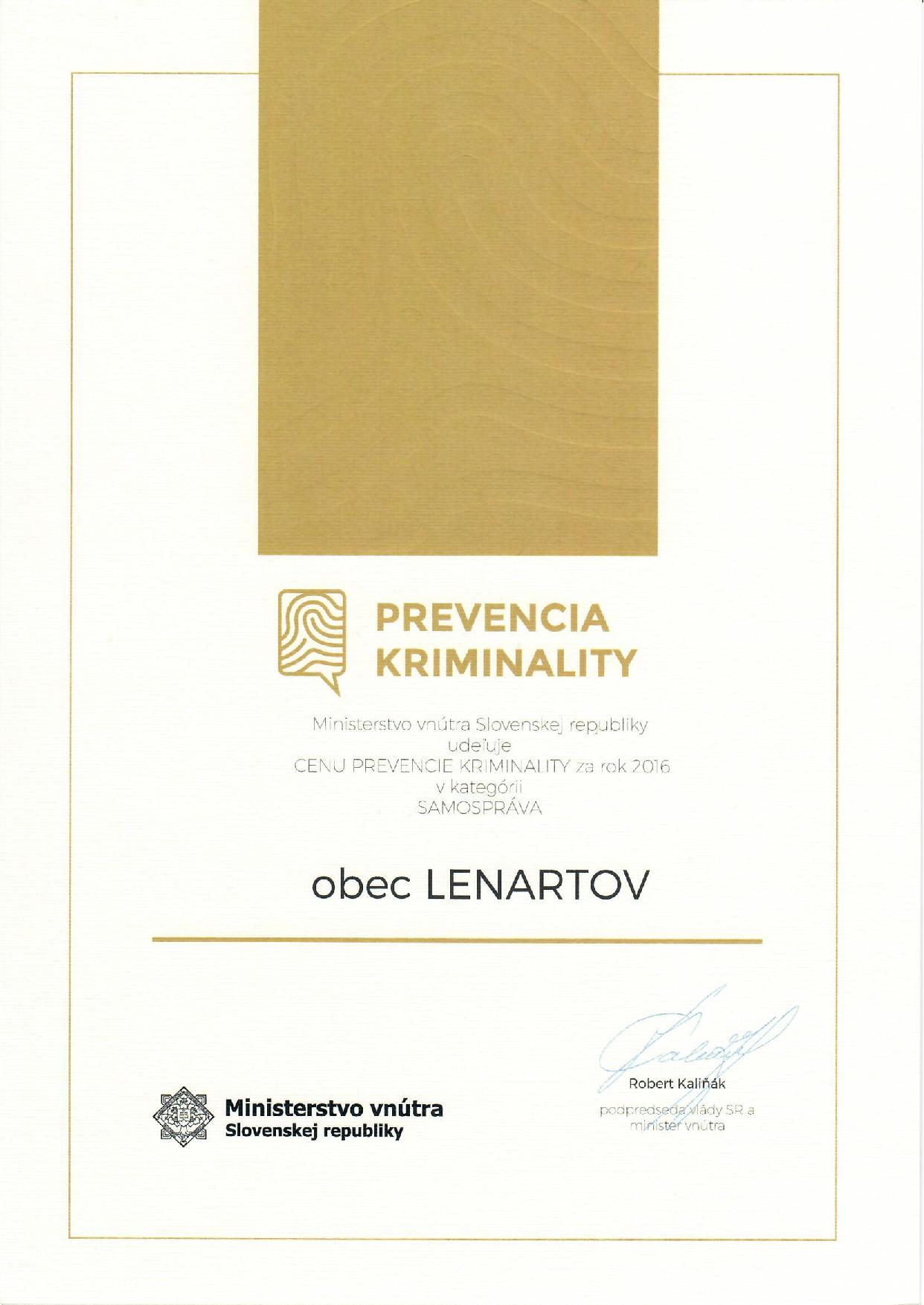 ,,CENA PREVENCIE KRIMINALITY ZA ROK 2016 v kategórií SAMOSPRÁVA” r. 2017