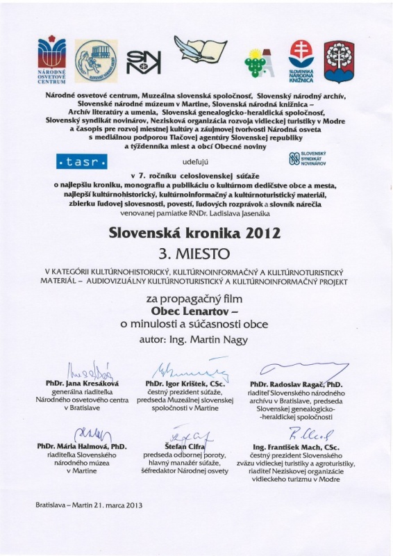 V Súťaží Najkrajšia kniha a propagačný materiál o Slovensku získala obec Lenartov osobitné ocenenie za osvetľovanie histórie a mapovanie kultúrneho dedičstva za Spomienky na druhú svetovú vojnu a Piesne z údolia Večného potoka.