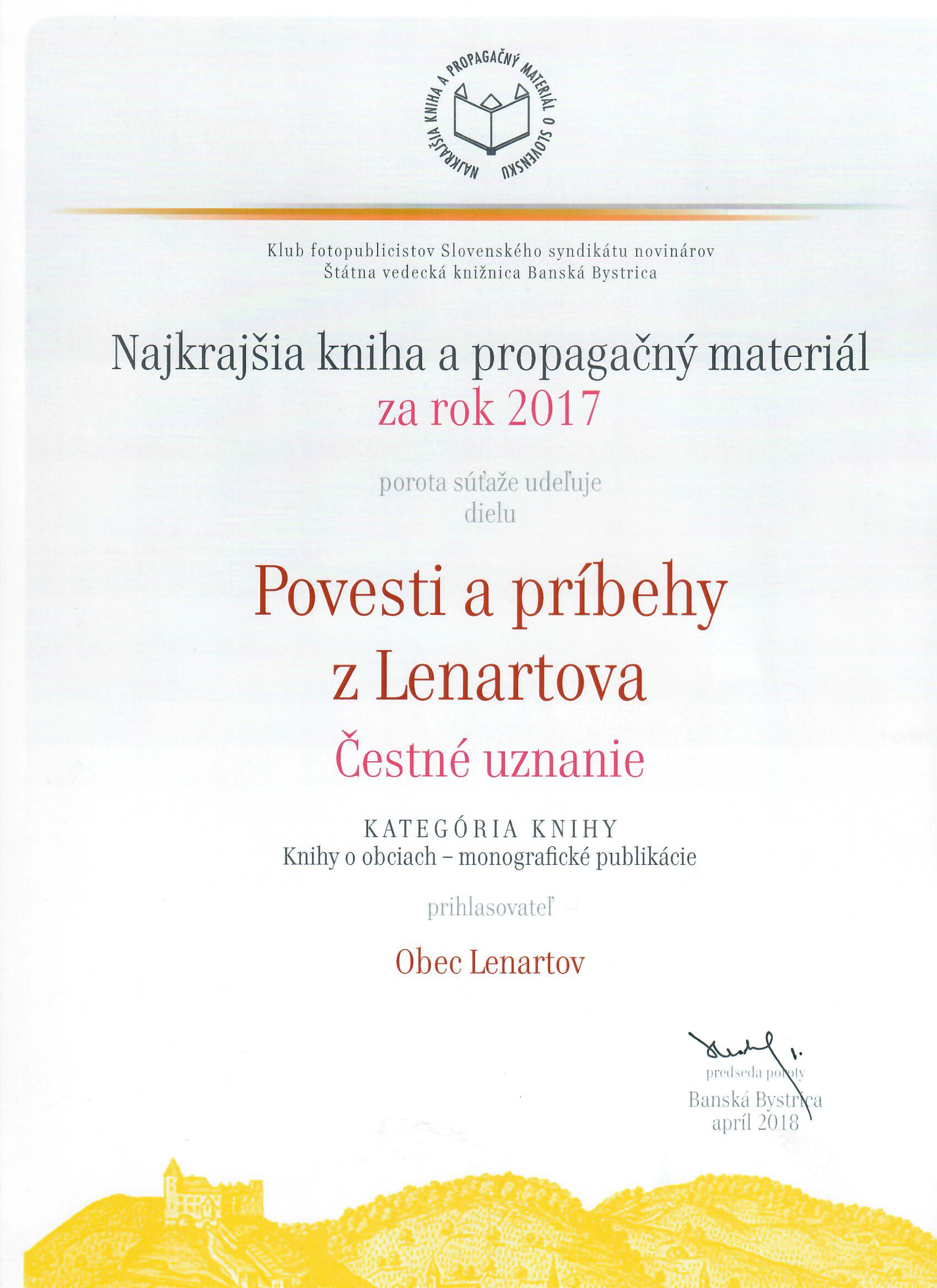 V súťaži Najkrajšia kniha a propagačný materiál za rok 2017 získala obec Lenartov ČESTNÉ UZNANIE za knihu ,,Povesti a príbehy z Lenartova”
